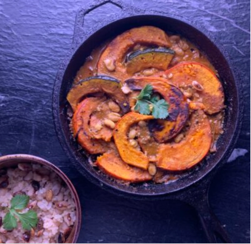 Roasted red pepper paste, tomato and onions with fragrant spices; lentils, and brown rice, fresh cilantro and beautiful spinach from our winter tunnel!